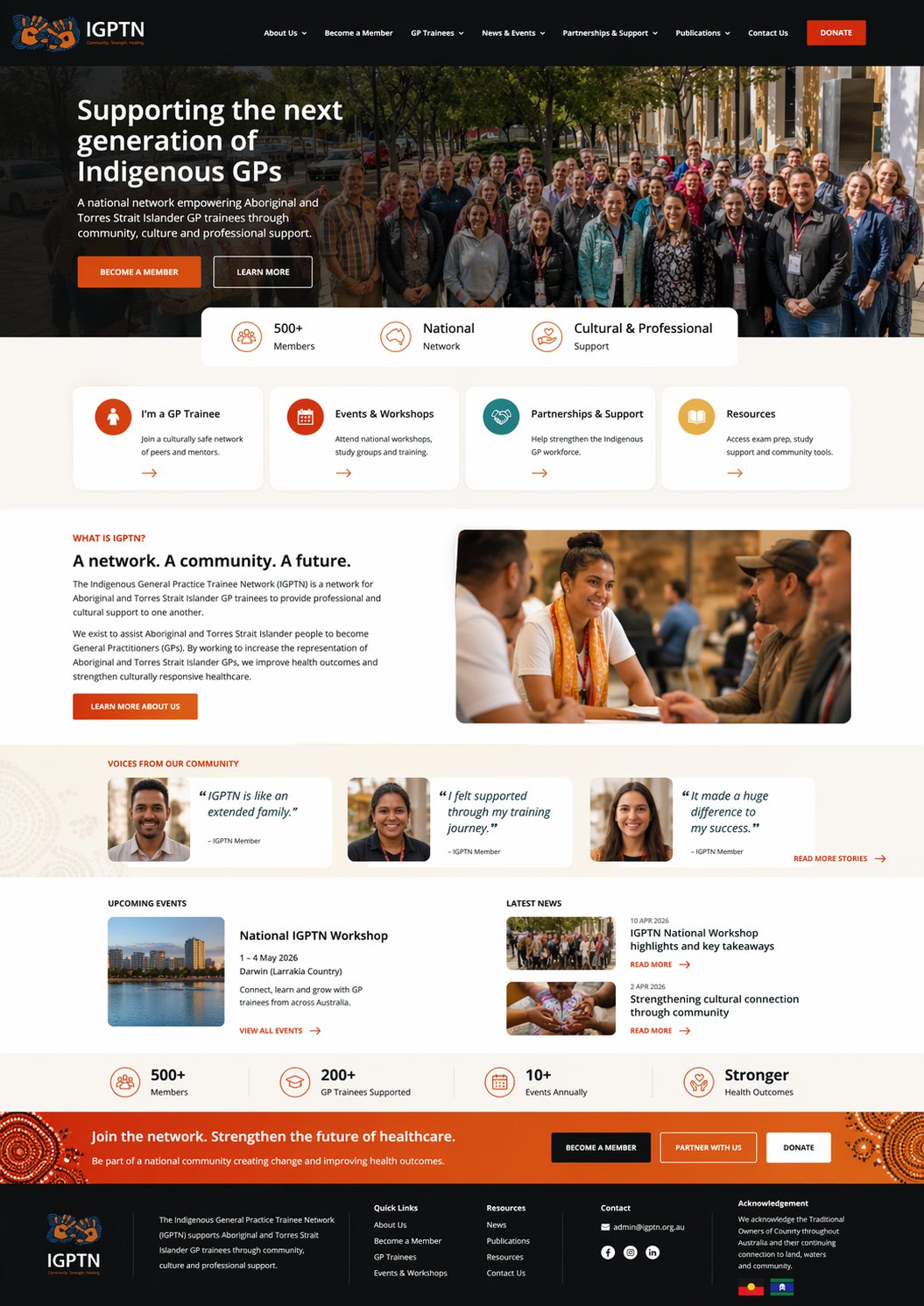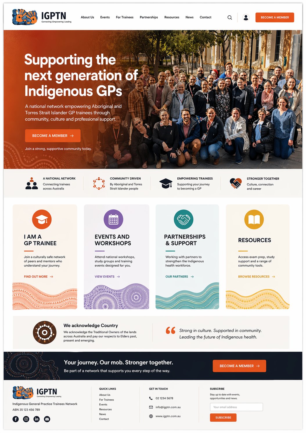 IGPTN are an Aboriginal and Torres Strait Islander not-for-profit organisation that strives for training and workforce equity for Aboriginal and Torres Strait Islander GPs. We humbly recognise that this land was never ceded and support truth-telling, declonisation and self determination. IGPTN acknowledges all Aboriginal and Torres Strait Islander Peoples of this land and celebrates their enduring connection to Country, sea and waterways as well as their traditional knowledge systems of teaching and learning. We pay our deepest respects to Ancestors and Elders who watch over us and guide us.